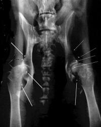Bei dieser angeborenen Fehlfunktion des Hüftgelenkes kommt es früher oder später zu einer arthrotischen (verknöchernden) Veränderung der Gelenkpfanne und/oder des Oberschenkelkopfes, die aufgrund der dabei auftretenden Schmerzen auch sehr qualvoll für den Hund ist.